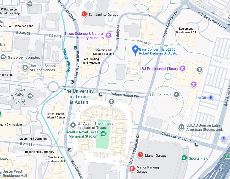 There are a variety of parking options available in the University of Texas campus surface lots and garages, making it simple and convenient. Bass Concert Hall has a few easy parking options for visitors. While the venue itself doesn’t have a dedicated parking lot, the University of Texas provides multiple parking options and surface lots within walking distance.